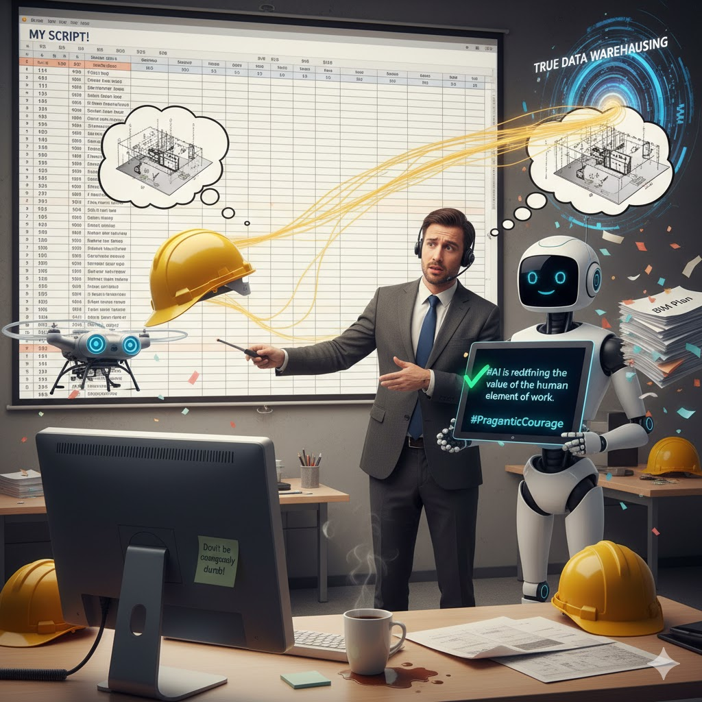 A courageously dumb BIM manager takes pride in a little script he wrote to make an Excel file out of a 3D model. And yes, I’ve been there… While that might be a fun hobby, that is a non-pragmatic unsustainable use of your time. Find the puzzle pieces and put them together. Build from what exists. Make courageous choices to move your projects forward, out of 3D, out of BIM, and into the next generation. When Digital Construction is the norm, we will build better in reality.
